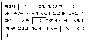 다음은 위로 던져 올라가는 동안 물체의 역학적 에너지에 대한 설명이다. ㉠~㉣에 들어갈 내용으로 옳은 것은? (단, ㉠, ㉡은 에너지의 한 종류이고, ㉢, ㉣은 증가/감소/일정 중 하나이다)