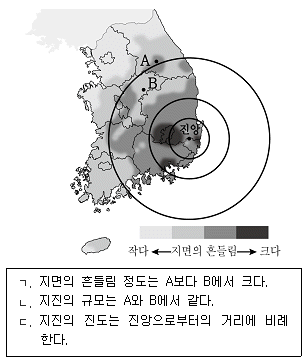 그림은 우리나라에서 발생한 어느 지진에 대해 각 지진 관측소에서 기록한 지면의 흔들림 정도를 나타낸 것이다. 동심원은 진앙으로부터의 동일 거리를 표시한 것이다. 이에 대한 설명으로 옳은 것만을 모두 고른 것은?