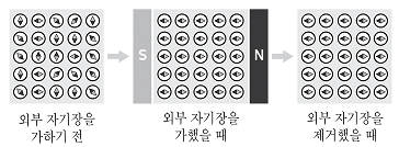 그림은 외부 자기장의 변화에 따른 어떤 물질 내부의 원자 자석 배열 변화를 나타낸 것이다. 이 물질의 자기적 성질에 대한 설명으로 옳지 않은 것은?