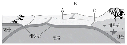 그림은 판의 경계를 모식적으로 나타낸 것이다. 이에 대한 설명으로 옳은 것은?