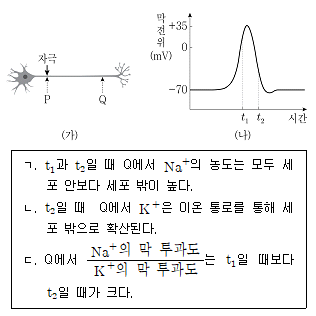 그림 (가)는 어떤 뉴런을, (나)는 지점 P에 역치 이상의 자극을 준 후 지점 Q에서 일어난 막전위 변화를 나타낸 것이다. 이에 대한 설명으로 <보기>에서 옳은 것만을 모두 고르면?