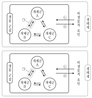그림은 생태계를 구성하는 요소 사이의 상호 관계를 나타낸 것이다. ㉠~㉢은 각각 상호 작용, 작용, 반작용 중 하나이다. 이에 대한 설명으로 옳지 않은 것은?