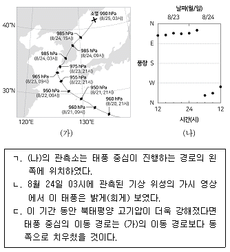 그림 (가)는 어느 태풍 중심의 이동 경로를, (나)는 이 태풍 중심이 이동하는 동안 우리나라의 어떤 관측소에서 측정한 풍향이 북동풍(NE)에서 북서풍(NW)으로 변화한 것을 나타낸 것이다. 이에 대한 설명으로 <보기>에서 옳은 것만을 모두 고르면?
