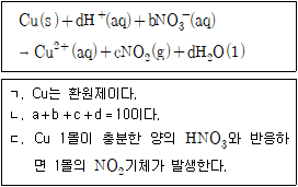 다음은 구리(Cu)와 질산(HNO3)이 반응하여 이산화 질소(NO2) 기체가 발생하는 반응을 나타낸 것이다. 이에 대한 설명으로 <보기>에서 옳은 것만을 모두 고르면? (단, a~d는 반응 계수이다)