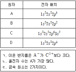 표는 원자 A~D의 바닥상태 전자 배치를 나타낸 것이다. 이에 대한 설명으로 <보기>에서 옳은 것만을 모두 고르면? (단, A~D는 임의의 원소 기호이다)