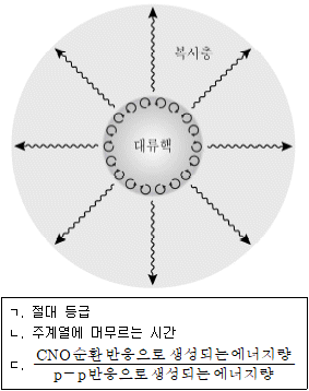그림은 어느 주계열성 A의 내부 구조를 나타낸 것이다. A가 태양보다 큰 값을 갖는 물리량으로 <보기>에서 옳은 것만을 모두 고르면?