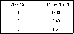 표는 보어의 수소 원자 모형에서 양자수 n이 1, 2, 3일 때 에너지 준위를 나타낸 것이다. n이 1, 2, 3인 에너지 준위 간에 전자가 전이할 때, 흡수 또는 방출할 수 있는 광자의 에너지로 옳지 않은 것은? (단, 전자가 전이할 때 1개의 광자를 흡수 또는 방출한다)
