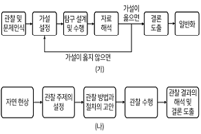 그림 (가)와 (나)는 서로 다른 과학의 탐구 방법을 나타낸 것이다. 이에 대한 설명으로 옳은 것은?