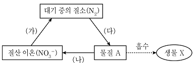 그림은 생태계에서 일어나는 질소 순환 과정 중 일부를 나타낸 것이다. 물질 A는 이온 형태이며, (다) 과정에는 뿌리혹박테리아가 관여한다. 이에 대한 설명으로 옳지 않은 것은?