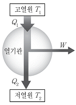 그림은 열효율이 0.25인 카르노 열기관이 절대 온도 T1의 고열원에서 Q1의 열을 흡수하여 W의 일을 하고 절대 온도 T2의 저열원으로 Q2의 열을 방출하는 것을 나타낸 것이다. Q2=6Q, T1=8T일 때, Q1과 T2의 값은? (순서대로 Q1, T2)