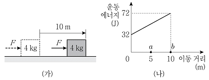 그림 (가)는 마찰이 없는 수평면에서 운동 중인 질량이 4kg인 물체에 일정한 크기의 힘 가 운동 방향으로 작용하여 물체가 10m를 이동한 것을 나타낸 것이다. 그림 (나)는 (가)의 물체에 가 작용한 순간부터 물체의 운동 에너지를 이동 거리에 따라 나타낸 것이다. 이에 대한 설명으로 옳지 않은 것은?