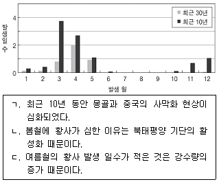 그림은 우리나라의 최근 30년과 10년 동안의 월 평균 황사 발생 일수를 비교하여 나타낸 것이다. 이에 대한 설명으로 <보기>에서 옳은 것만을 모두 고르면?