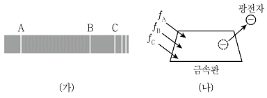 그림 (가)는 수소 원자의 선스펙트럼을, (나)는 (가)의 A, B, C에 해당하는 빛을 금속판에 동시에 비추었을 때 광전자가 방출되는 것을 나타낸 것이다. A, B, C는 각각 양자수가 n=3, n=4, n=5인 궤도에서 n=2인 궤도로 전자가 전이할 때의 방출선이고, fA, fB, fC는 각각 A, B, C에 해당하는 빛의 진동수들이다. 어떤 금속판의 문턱 진동수가 보다 크다고 할 때, 이 현상에 대한 설명으로 옳은 것은?