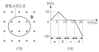 그림 (가)는 지면에 수직으로 들어가는 방향으로 균일하게 형성된 자기장 영역에 원형고리도선이 고정된 것을 나타낸 것이고, (나)는 (가)에서 주어진 자기장의 세기(B)를 시간에 따라 나타낸 것이다. 각 구간 a, b, c, d에서 원형고리도선에 유도되는 전류의 세기를 각각 Ia, Ib, Ic, Id라고 할 때, 그들의 크기 순서를 옳게 나타낸 것은?