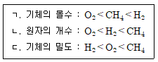 0℃, 1기압에서 수소(H2), 메테인(CH4), 산소(O2) 기체가 각각 1g씩 따로 존재한다. 각 기체에 대한 물리량의 크기 비교로 옳은 것만을 <보기>에서 모두 고른 것은? (단, 수소, 탄소, 산소의 원자량은 각각 1, 12, 16이다)
