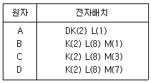 표는 바닥상태에 있는 중성원자 A, B, C, D의 전자들이 전자껍질 K, L, M에 배치된 상태를 나타낸 것이다. 이에 대한 설명으로 옳은 것은? (단, A, B, C, D는 임의의 원소 기호이다)
