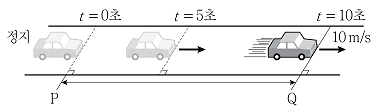 그림은 자동차가 직선도로를 따라 등가속도 운동을 하는 모습을 나타낸 것이다. P점에서 정지해 있다가 출발한 자동차가 10초 후 Q점을 통과할 때 속력은 10m/s이었다. 이에 대한 설명으로 옳은 것은?