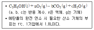 다음 에탄올의 연소 반응에 대한 설명으로 옳은 것은? (단, t℃, 1기압에서 기체 1몰의 부피는 24L이고, 에탄올의 분자량은 46이다)