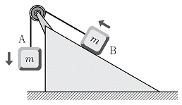 그림과 같이 질량이 m으로 동일한 두 물체 A, B를 실과 도르래로 연결한 후 가만히 놓았더니 두 물체가 화살표 방향으로 움직이기 시작하였다. 물체 A의 연직 높이가 h만큼 내려왔을 때 물체 B의 연직 높이는 h'만큼 올라갔다. A의 감소한 중력 퍼텐셜 에너지가 A의 증가한 운동 에너지의 3배일 때 h'은? (단, 실은 길이가 변하지 않고 질량이 없으며 도르래는 마찰이 없고 질량이 없으며, 빗면은 바닥에 고정되어 있고 표면의 마찰이 없으며, 공기 저항은 무시한다)