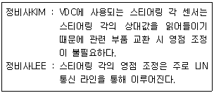 차체자세제어장치(VDC : vehicle dynamic control)장착 차량의 스티어링 각 센서에 대한 두 정비사의 의견 중 옳은 것은?