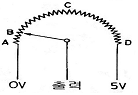 다음 그림은 스로틀 포지션 센서(TPS)의 내부회로도이다. 스로틀 밸브가 그림에서 B와 같이 닫혀 있는 현재 상태의 출력전압은 약 몇 V인가? (단, 공회전 상태이다.)