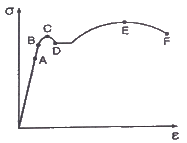 그림과 같은 탄소강의 응력(σ)-변형율(ε)선도에서 각 점에 대한 내용으로 적절하지 않은 것은?