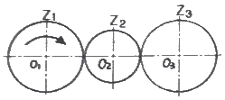 그림과 같은 기어열에서 각 기어의 잇수가 Z1=40, Z2=20, Z3=40 일 때 O1 기어를 시계방향으로 1회전 시켰다면 O3 기어를 어느 방향으로 몇 회전 하는가?