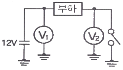 다음 회로에서 전압계 V1과 V2를 연결하여 스위치를 ⌜ON⌟ , ⌜OFF⌟ 하면서 측정한 결과로 옳은 것은? (단, 접촉저항은 없음)