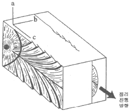 다음은 Hodgson(1961)의 이상적인 절리발달양상을 보여주는 그림이다. 그림에서 a, b, c 세 주응력축의 이름을 순서대로 옳게 나열한 것은? (단, σ1은 최대주응력, σ2는 중간주응력, σ3는 최소주응력이다.)