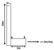 그림에서 유체의 흐름은 일정하고(steady), 유출속도(v)도 2m/day로 일정하다. 또한, A와 B 지점 사이의 투수계수 KAB=10m/day이며, A 지점의 수두 hA=10m이다. 이때 B 지점에서의 수두는?