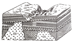 아래 지층 (1)의 퇴적시기로 옳은 것은? (단, 화성암 (2)의 관입시기는 1억 년 전이고, 화성암 (3)의 관입시기는 7000만 년 전이다.)