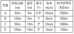 다음은 특정 지점에서의 하도 너비, 하도 깊이, 경사, 유석, 하구언까지의 거리를 측량하여 순서대로 나타낸 것이다. 하천의 유량이 가장 큰 지점은?
