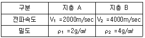 지층 A, B의 전파속도와 밀도가 다음과 같을 때, 두 지층의 경계면에서의 탄성파 반사계수는? (단, 탄성파는 수직으로 입사되었다고 가정한다.)