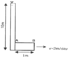 그림에서 유체의 흐름은 일정하고(steady), 유출속도(v)도 2m/day로 일정하다. 또한 A와 B지점 사이의 투수계수 KAB=10m/day이며, A지점의 수두는 hA=10m이다. 이 때 B지점에서의 수두는 얼마인가?