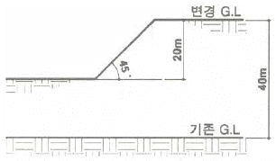 다음과 같은 지형의 기반에 성토하였을 때 포화 점토사면의 파괴에 대한 안전율은 얼마인가? (단, 토양의 포화 단위중량은 2.0ft/m3, ø=0, 흙의 전단강도정수 C=6.5tf/m2, 안정계수 Ns=5.55이다.)