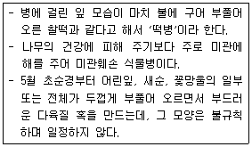 다음 특징의 병해가 주로 발생하는 수목은?
