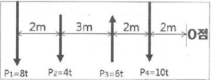 다음 그림에서와 같은 평행력에 있어서 P1, P2, P3, P4의 합력의 위치는 0점에서의 몇 m거리에 있겠는가?
