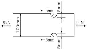 그림과 같이 두께가 20mm, 폭이 100mm인 평판에 반원형 노치(notch)가 파여 있다. 평판의 양단에는 9kN의 인장하중이 작용하고 있다. 반원형 노치부분의 응력집중계수가 K=3.1일 때, 평판에 발생하는 최대응력은?