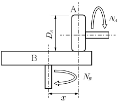 그림과 같은 무단변속 마찰차에서 원동차 A와 종동차 B의 회전수가 각각 1,200rpm, 800rpm이 되기 위한 원동차 A의 위치 x는? (단, 원동차와 종동차의 접촉부에서 미끄러짐이 없다고 가정하며, DA=400mm이다.)