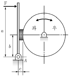 그림과 같은 단식 블록브레이크에서 우회전할 때의 레버 조작력 F1에 대한 좌회전할 때의 레버 조작력 F2의 비(F2/F1)는? (단, μ는 마찰계수이다.)
