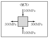<보기>와 같이 임의의 단면에 수평방향으로 300MPa의 인장응력이 작용하고 수직방향으로 100MPa의 압축응력이 작용하는 경우 최대 전단응력의 크기는? (단, 최대 전단응력 이론을 따른다.)