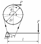 브레이크 드럼축에 300,000N·mm의 토크가 작용하는 밴드 브레이크가 있다. 드럼축의 우회전을 멈추기 위해 브레이크 레버에 주는 힘 F의 값[N]은? (단, D=200mm, l=500mm, a=50mm, eμθ=4로 한다.)