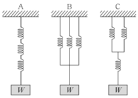 다음 그림과 같이 A, B, C에 대해 같은 하중 W가 가해졌다면, 각 스프링의 변형된 길이의 비로 옳은 것은? (단, 각 스프링의 강성은 동일하고, 스프링의 무게는 무시한다.)