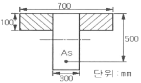 그림과 같은 T형 보에서 빗금 친 부분의 압축강도와 같은 크기의 힘을 발휘하는 인정철근의 단면적(Asf)은? (단, fck=18MPa, fy=300MPa이다.)