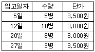 다음은 간장의 재고 대상이다. 간장의 재고가 10병일 때 선입선출법에 의한 간장의 재고자산은 얼마인가?(문제 오류로 실제 시험당일 가답안으로 ‘1’를 발표하였지만 확정답안에서는 답안 오류가 인정되어 모두 정답 처리 되었습니다. 여기서는 ‘1’번을 정답 처리 합니다.)
