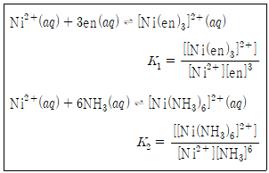 [Ni(en)3]2+의 생성 평형상수(K1)가 [Ni(NH3)6]2+의 생성 평형상수(K2)보다 1010배만큼 더 크다. 이 차이를 설명할 수 있는 가장 적절한 효과는? (단, en=1,2-ethylenediamine)