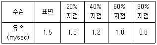 수심이 0.6m, 폭이 2m인 하천의 유량을 구하기 위해 수심 각 부분의 유속을 측정한 결과가 다음과 같다. 하천의 유량(m3/sec)은? (단, 하천은 장방형이라 가정한다.)
