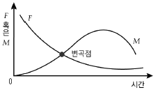 미생물의 성장과 유기물과의 관계곡선 중 변곡점까지의 미생물의 성장상태를 가장 적절하게 나타낸 것은? (단, F : 먹이인 유기물량, M : 미생물량)