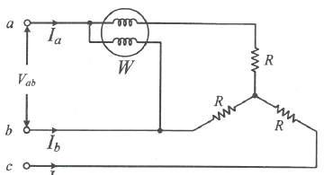 선간 전압이 Vab(V)인 3상 평형 전원에 대칭 부하 R(Ω)이 그림과 같이 접속되어 있을 때, a,b 두 상 간에 접속된 전력계의 지시 값이 W(W)라면 C상 전류의 크기(A)는?