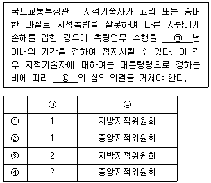 <보기>는 「공간정보의 구축 및 관리 등에 관한 법률」상 측량기술자의 업무정지 등에 관한 내용이다. <보기>의 ㉠, ㉡에 해당하는 사항을 옳게 짝지은 것은?